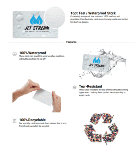 Through the use of a high quality substrate, this synthetic paper is perfect for customized and short run designs. Sourced from raw material, it is 100% recyclable, non-toxic, and extremely durable. The waterproof and tear resistant qualities guarantee that your business cards will always look great, even in the most adverse of conditions.