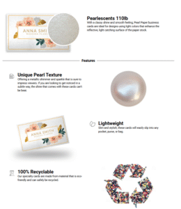 A unique stock that shimmers when seen at different angles, Pearl Paper business cards are ingrained with pearl fibers that give the paper a smooth, metallic look. It will also help to give the lighter colors of your design a subtle shimmer. Through its artistic aesthetic, it is perfect for designers, marketers, or anyone who wants to attract attention from an appearance standpoint.